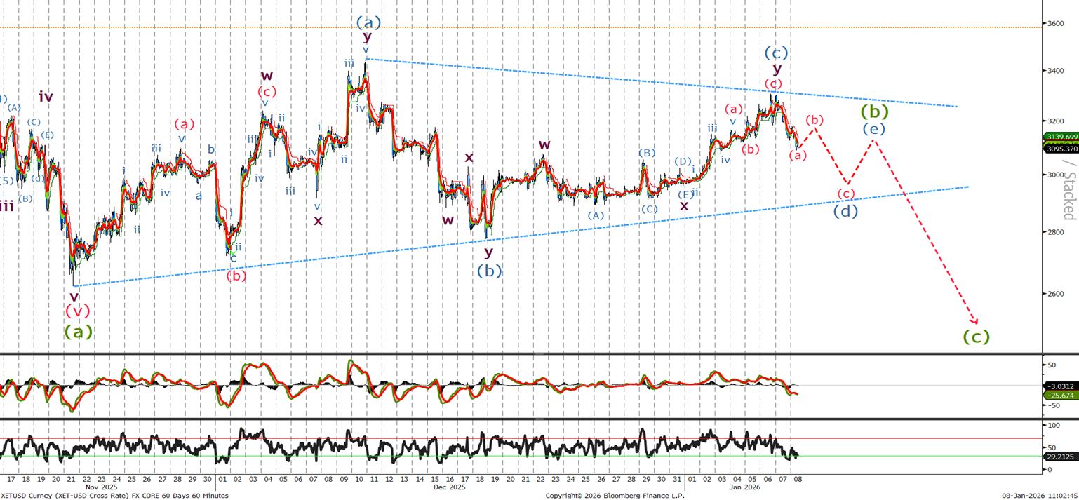Last time I said ‘We have sold at 3240 and if not short sell now at 3160 with stops above 3700 for a push below 2500.’ As previously mentioned it appears we are tracing out a triangle , if not short sell now at 3106 and lower stops loss levels above the wave (a) at 3450. A move above may signify a larger zigzag correction is playing out. Trading above 3700 will necessitate a change in the view and could signal the bullish trend has resumed.